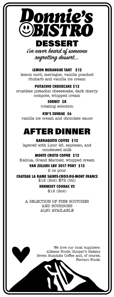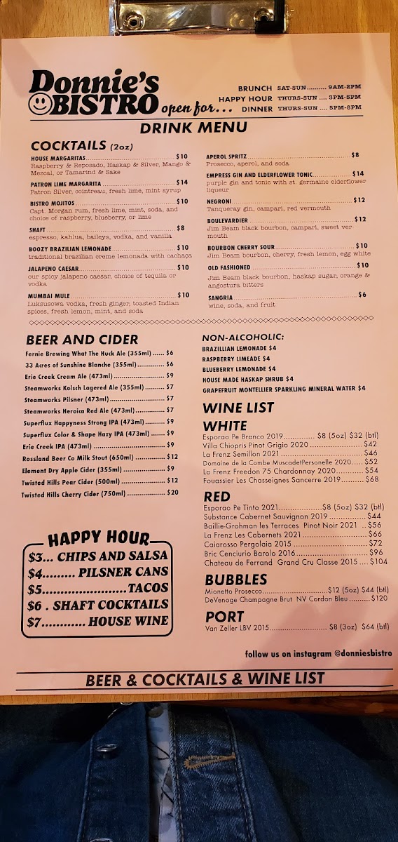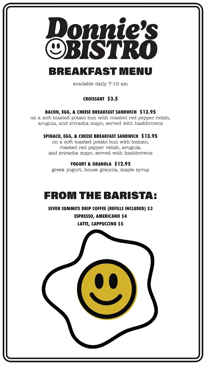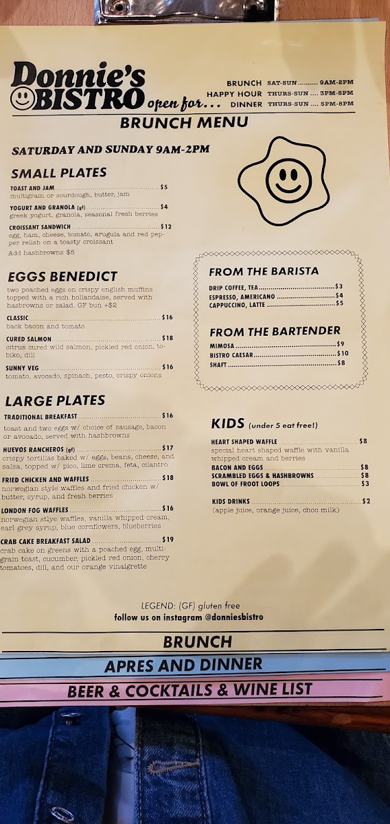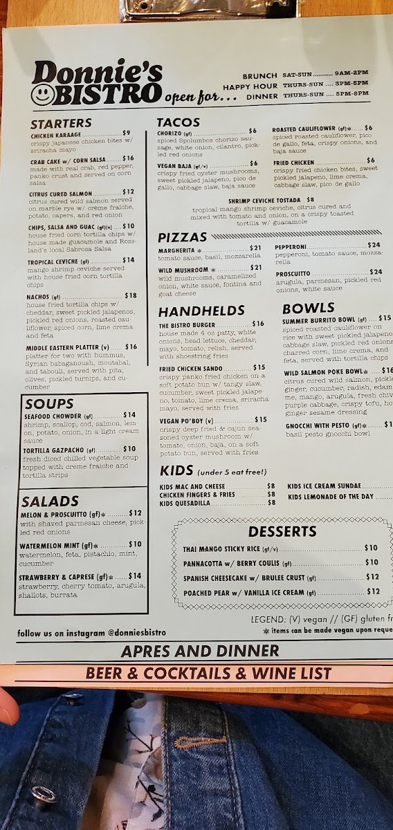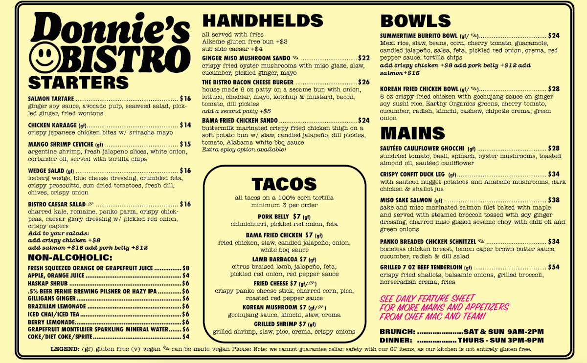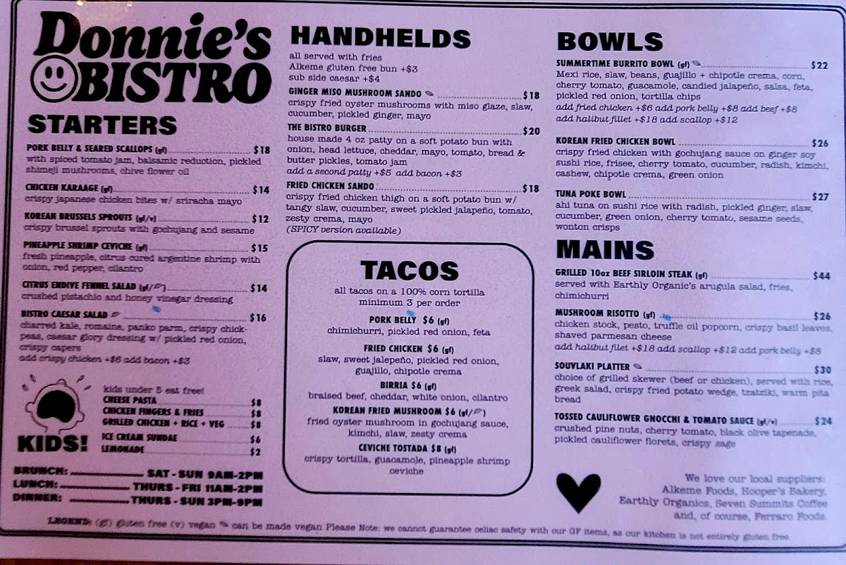 Welcome to Donnie's Bistro, a gem nestled in Rossland, BC, where culinary innovation meets a warm, friendly atmosphere. As you explore our menu, you’ll discover an enticing range of dishes that cater to all tastes. From our Handhelds like the mouthwatering Ginger Miso Mushroom Sando and the comfort-rich Bama Fried Chicken Sando, to vibrant Bowl selections such as the Summertime Burrito Bowl and Korean Fried Chicken Bowl, there’s truly something for everyone. Our Tacos, including the delectable Baja Shrimp and Lamb Barbacoa, burst with flavor and creativity. Diners have raved about the exceptional service, and the cozy vibe makes each visit special. Whether you're enjoying a family dinner or a casual brunch with friends, Donnie's Bistro promises a delightful culinary experience filled with fresh, high-quality ingredients and genuine hospitality.